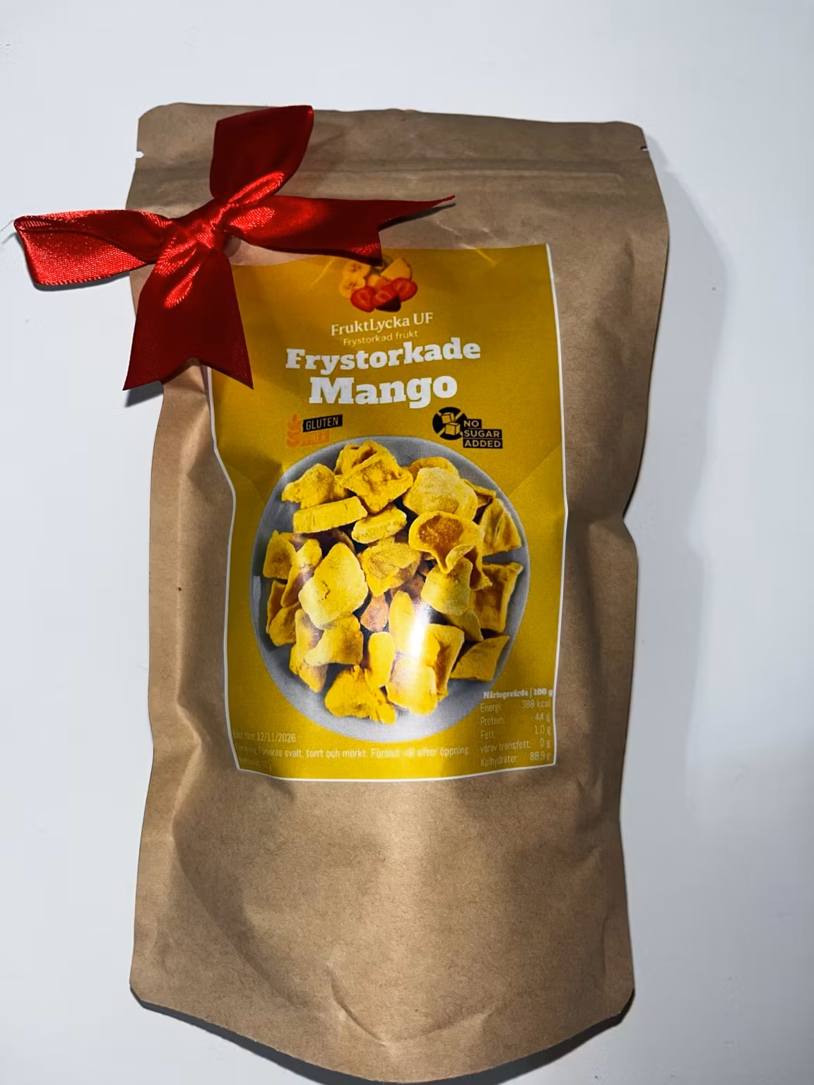 Frystorkad MangoBeskrivning:Söt och mjuk krispig mango med tropisk smak. Ett perfekt nyttigt snacks.Egenskaper:GlutenfriInget tillsatt socker100% mangoNettovikt