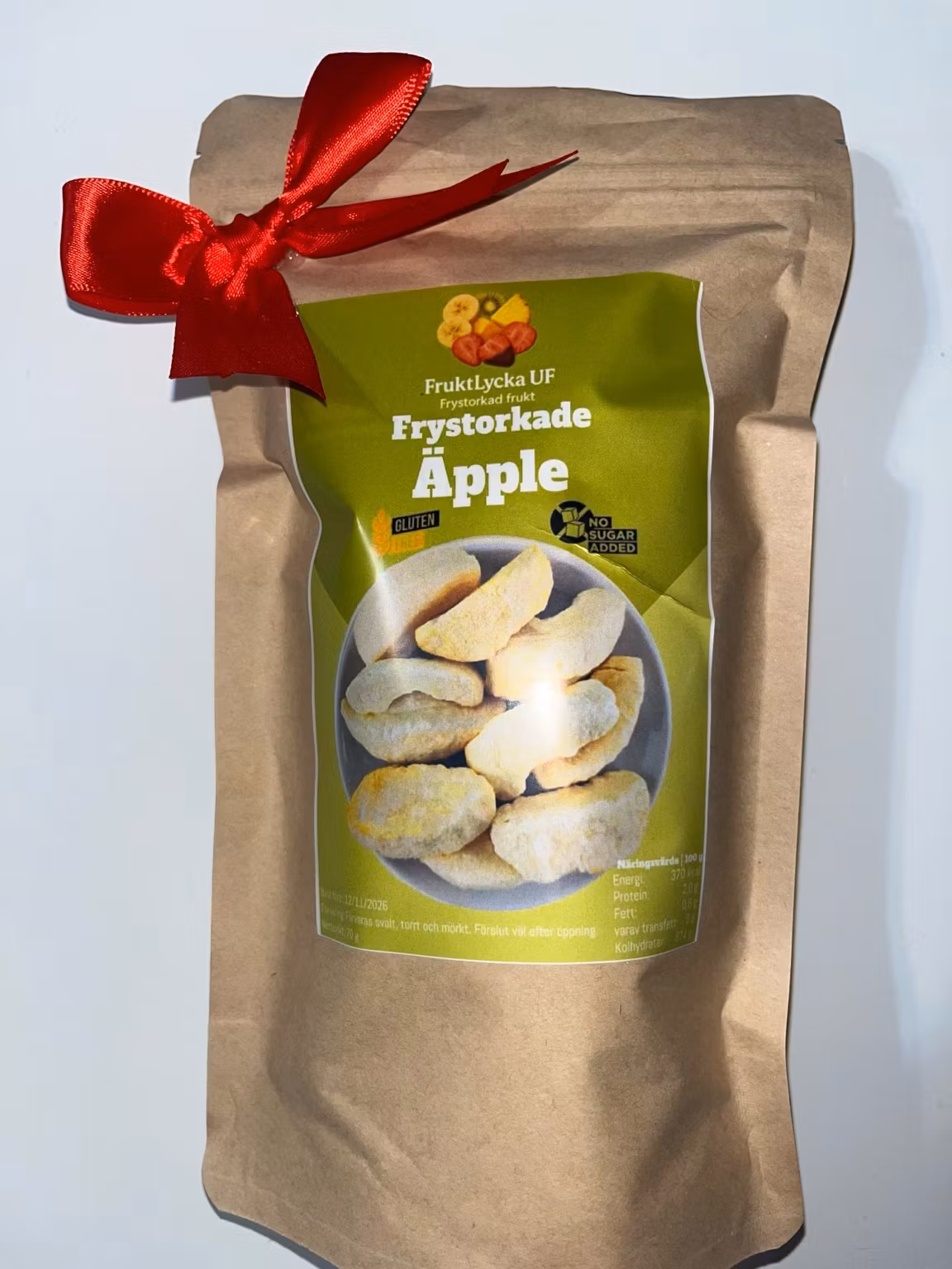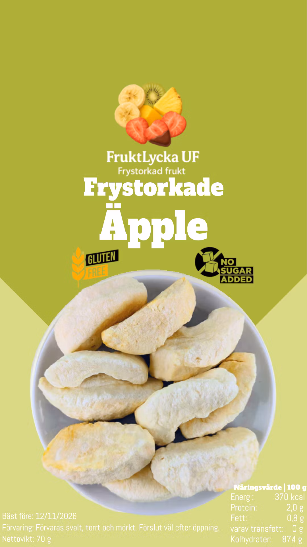 Frystorkade ÄpplenBeskrivning:Krispiga äppelklyftor med frisk och söt smak. Perfekt som snacks eller i müsli.Egenskaper:GlutenfriInget tillsatt socker100% äpple