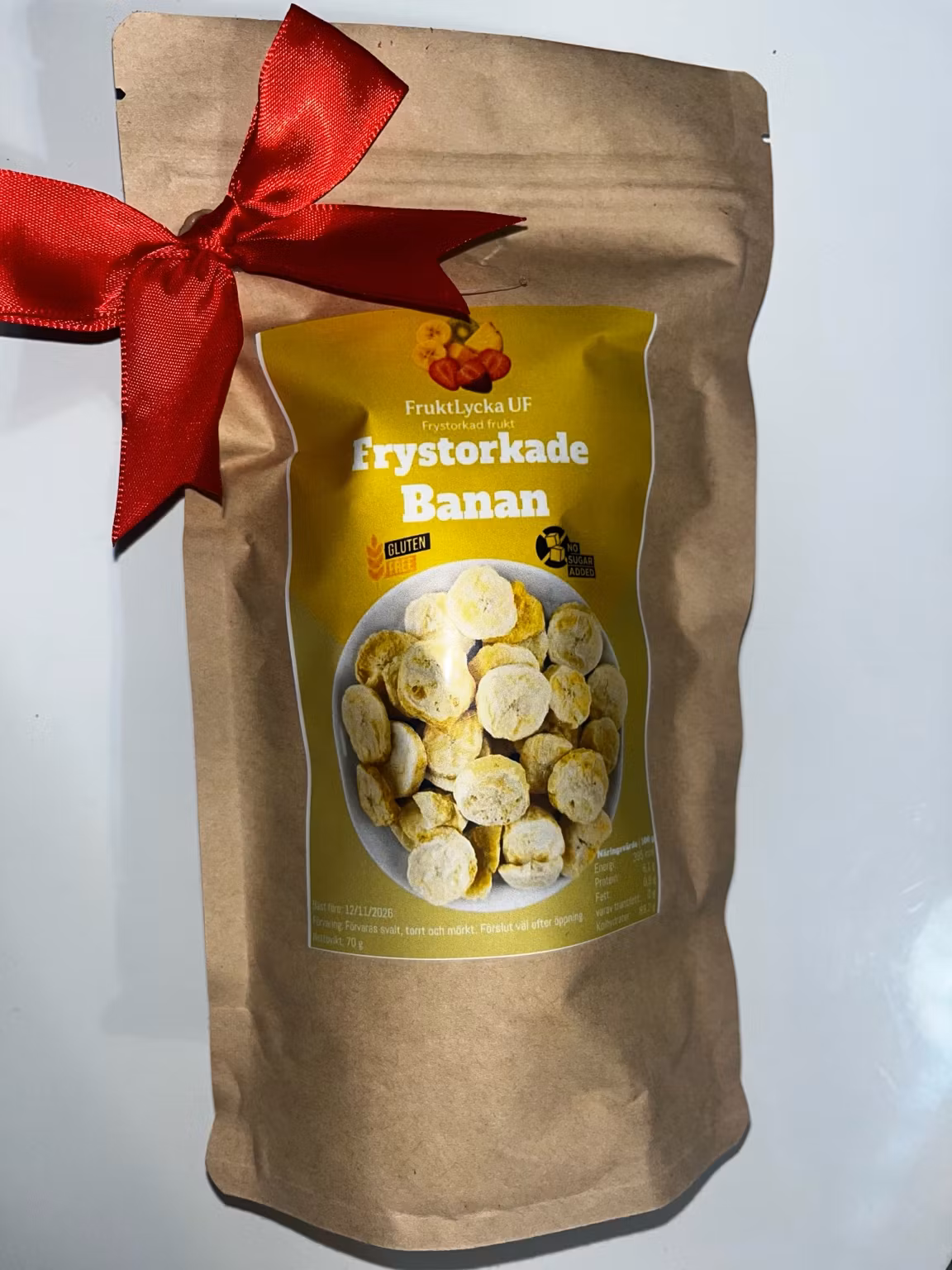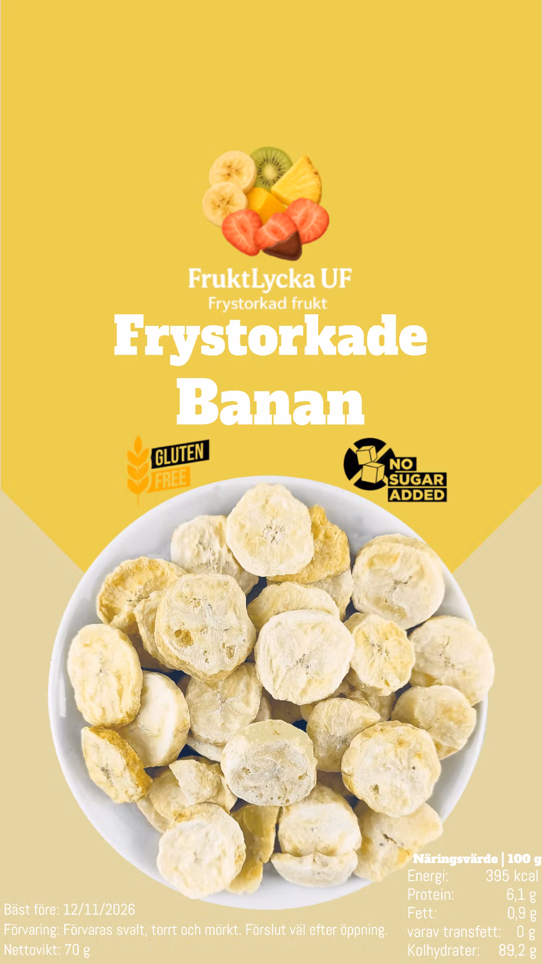 Frystorkade BananBeskrivning:Krispig och naturligt söt banan. Perfekt som snacks, i müsli eller i smoothies.Egenskaper:GlutenfriInget tillsatt socker100% bananN
