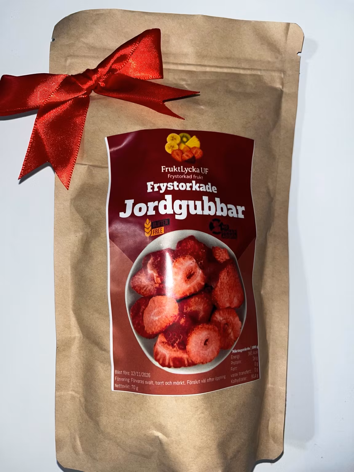 Frystorkade JordgubbarBeskrivning:Sötsyrliga jordgubbar som är krispiga och fulla av smak. Perfekt som snacks eller topping.Egenskaper:GlutenfriInget tillsatt s
